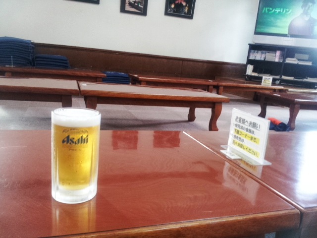 お風呂の後は2階が休憩室になって 食事も出来ます ではビールでまた宴会