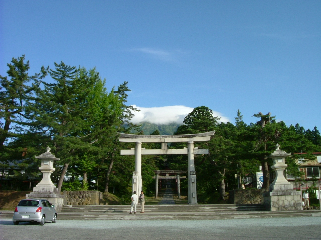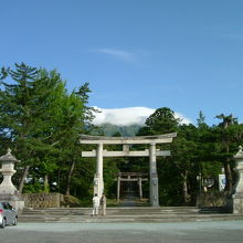 岩木山神社は、坂上田村麻呂が山頂に社殿を建て、父を祀ったというのが起源ですから、相当に古いです。岩木山は、もともとこの地方の信仰の対象だったのですが、その岩木山大神の加護によって東北平定を為し得たという感謝の印です。「帰ってこいよ」という流行歌で、この「おいわきやま」が歌われてもいて、平野にポツンとそびえる山が古くから親しまれているのは、極自然なことなのかもしれません。この鳥居から、岩木山に向かって、まっすぐに参道が続きます。なお、本殿や拝殿などは重要文化財です。