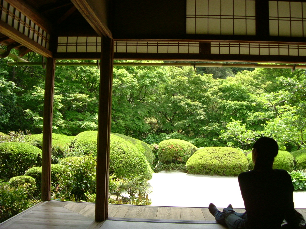 詩仙堂は、市バスのバス停「一乗寺下り松」から歩いて。ここは江戸時代初期の文人であり、徳川家の家臣であった石川丈山が隠居のため造営した山荘です。白い山茶花の植え込みの石段を登っていくと建物が見えてくるのですが、小さな木の門を潜っただけで、ちょっと格の違う雰囲気に気がつくと思います。名前の由来は、中国の詩家36人の肖像を掲げた詩仙の間。日本の三十六歌仙にならったもので、狩野探幽によって描かれた肖像画は、詩仙の間の四方に掲げられています。また、見所は縁側から眺める写真の景色。つつじの植え込みは春には花が緑の葉から浮いたように咲くのですが、こんな咲かせ方は、実はものすごい手の掛けようで、他では決してできません。あと、けっこうお勧めは、庭を下がったところにある白い藤。藤の匂いはすばらしくいいのですが、ここの藤は特にいいような気がします。お試しあれ。