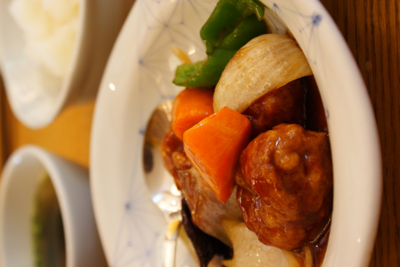 酢豚セットには前菜(ナスの煮たのとバンバンジー)とスープ、ごはんがつきます。