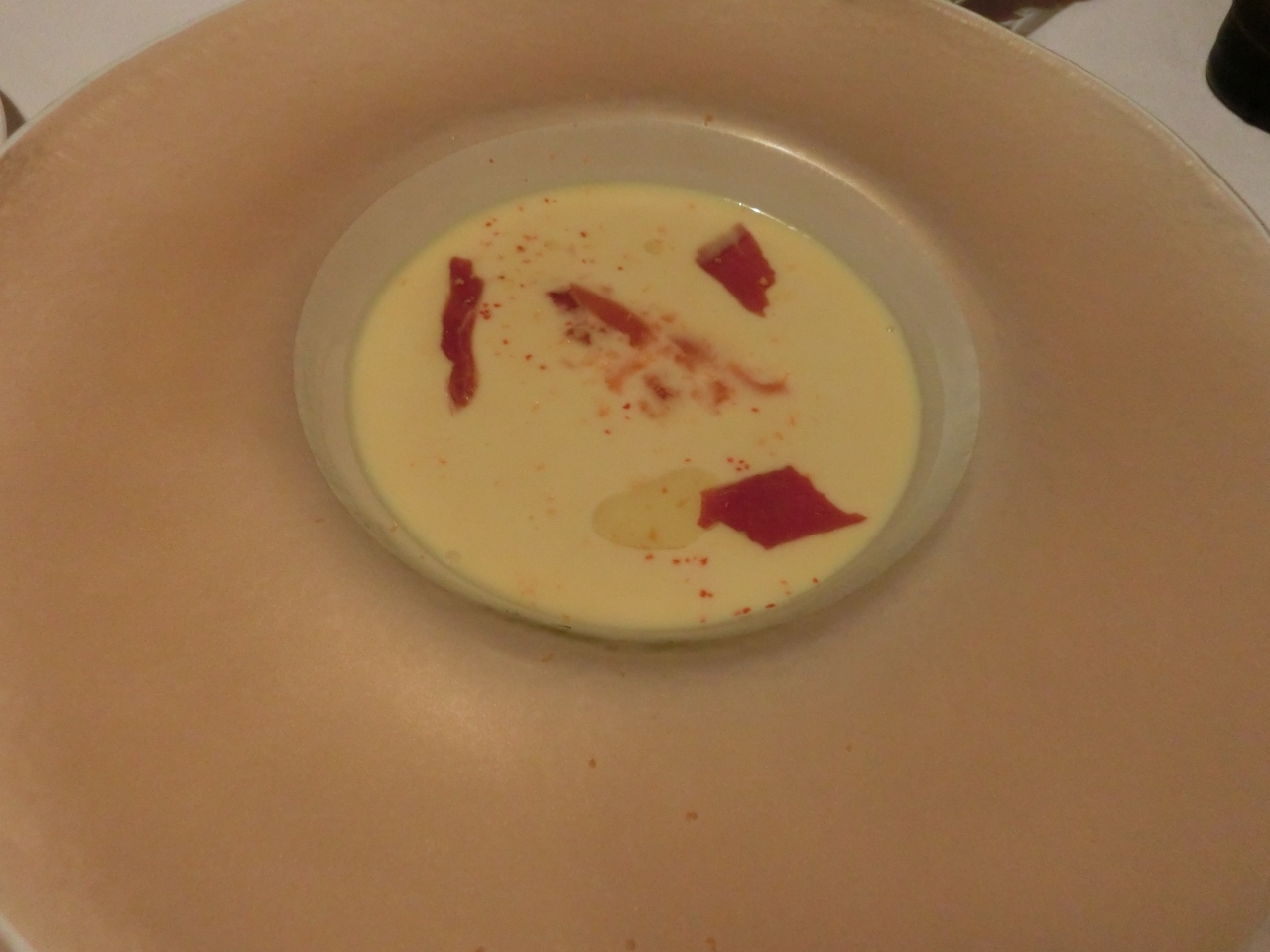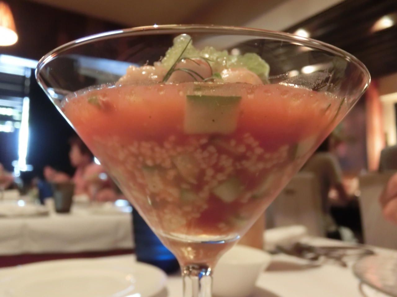 ・冷たい前菜 [b:ガスパチョスのスープに天使のエビ・クスクス・上には大葉を使ったシャーベット]