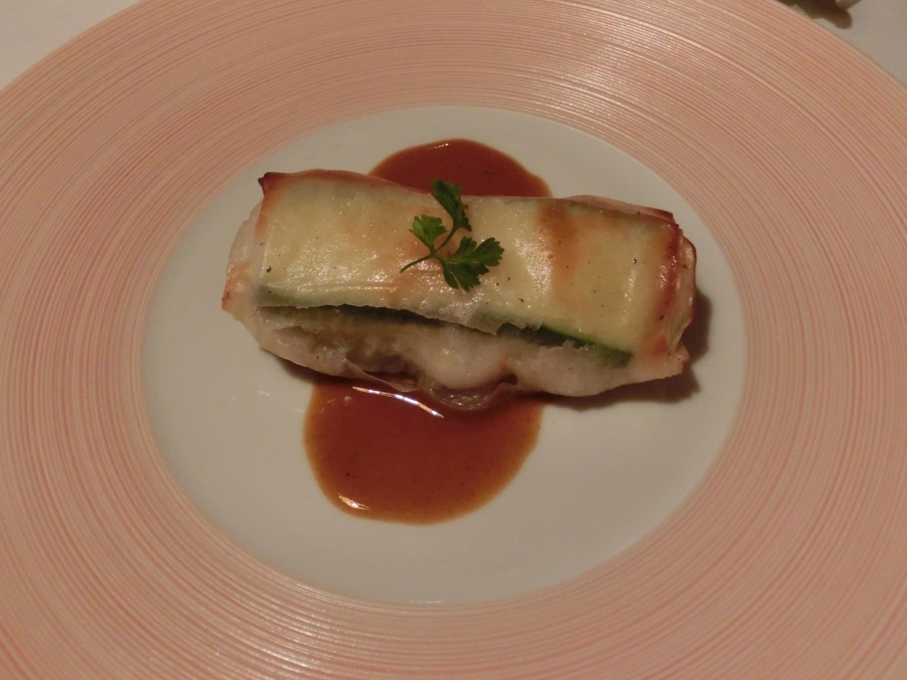 ・温かい前菜 [b:ホタテ・ズッキーニ・しいたけをトウモロコシで作った皮(名前を忘れてしまいましたが…)で巻いて、]