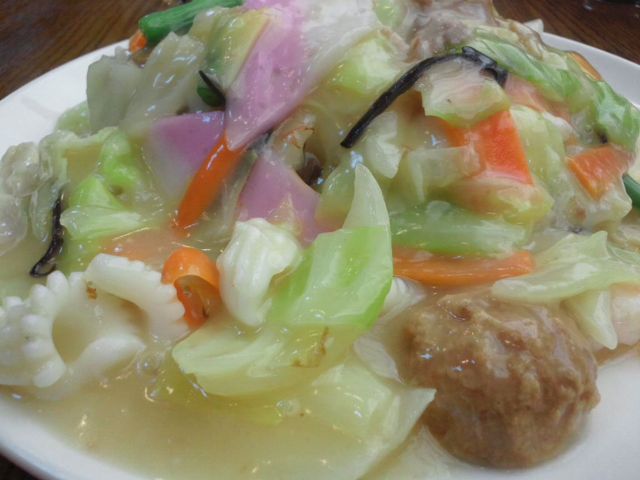 太麺はメニューに(あんかけなし)とあるように汁がなく、塩焼きそばみたいな感じだった。