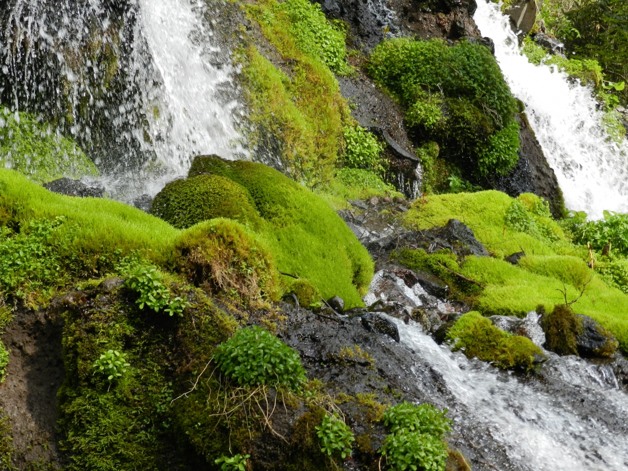 滝を形成する岩盤にびっしりと生えている苔が青々として、滝水の白&苔の緑のコントラストがとても美しい風景を造り出していました!
