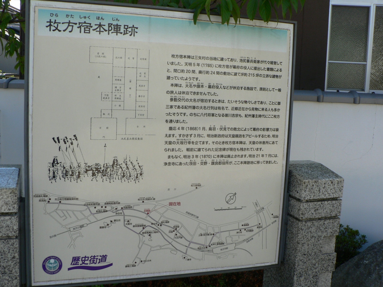 徳川幕府は17世紀後半に、東海道の延長である京街道沿いの岡新町・岡・三矢・泥町村を枚方宿と指定したが枚方宿の町並は現在の天野川左岸から建設省淀川工事事務所まで約1.5kmありこの間に本陣(ほんじん)・馬継所(うまつぎしょ)・人足継所(にんそくつぎしょ)を備え、その他旅籠(はたご)・、船宿、茶屋、寺院、民家約400軒などが軒を連ねていた。本陣(ほんじん)は大名が参勤交代(さんきんこうたい)のときなどの休泊に利用する施設で、枚方宿本陣は池尻善兵衛(いけじりぜんべえ)が世襲(せしゅう)して経営し、間口19間余、総坪数477坪あったといわれ徳川御三家紀州侯宿泊の場合は大賑わいし紀州祭と称したほどだった。枚方宿本陣は明治初年取りこわされ、茨田(まんだ)・交野・讃良(さらら)郡役所(後の北河内郡役所)が建てられたそうだが現在は三矢公園になっている。