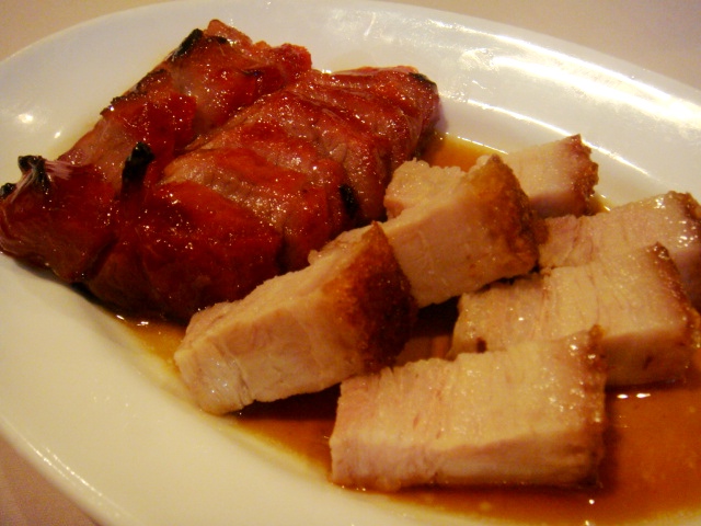 前菜は、蜜汁叉焼と豚バラカリカリ焼を合い盛りで。