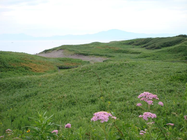 小清水原生花園駅を降りると、オホーツク海に沿ってお花畑が広がっています。