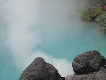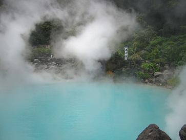 代表的な海地獄は硫酸鉄が溶解した神秘的なコバルトブルー色。