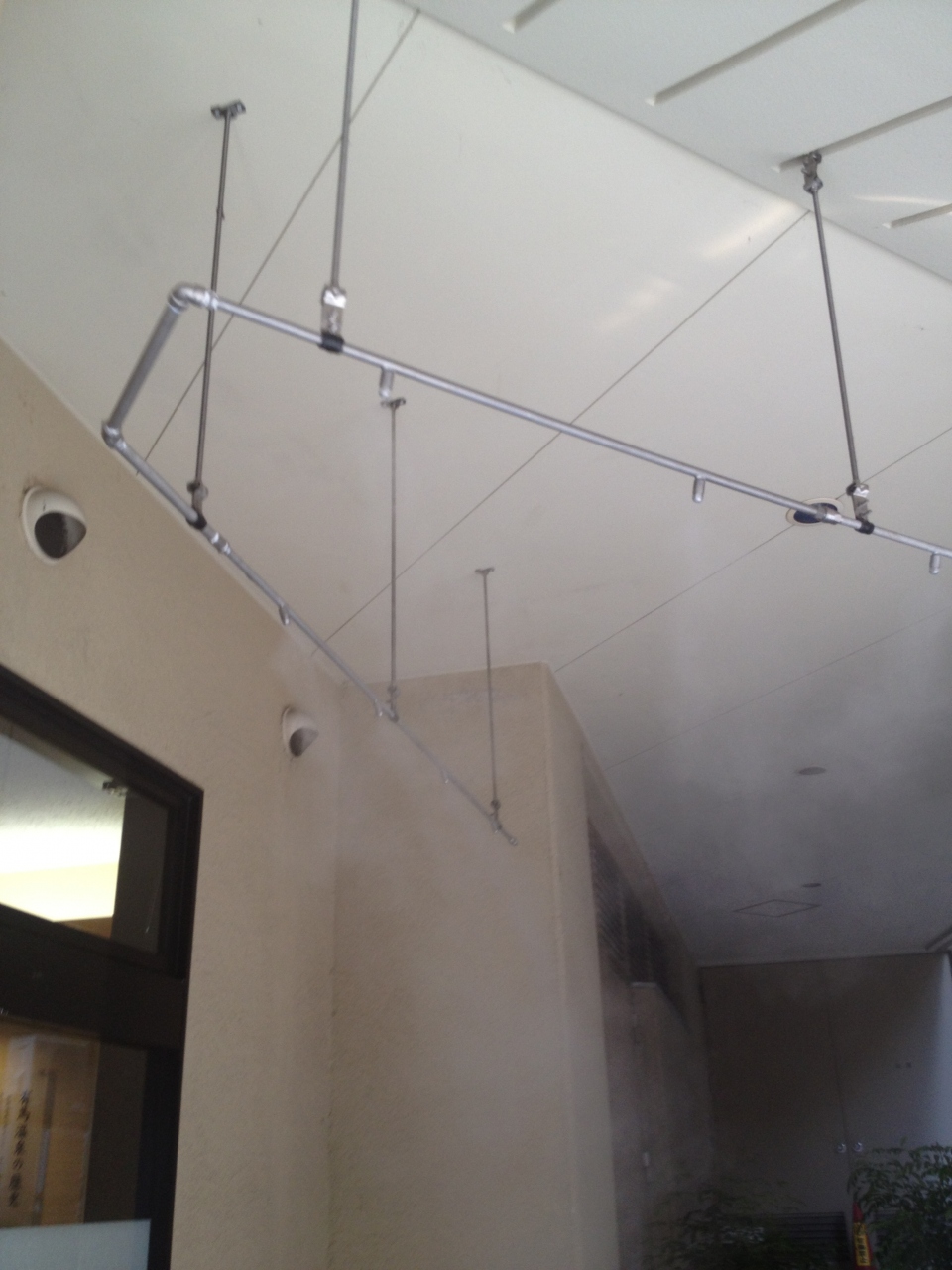 金の湯の玄関前にて、ミストによる心地良い雰囲気を提供してくれています。