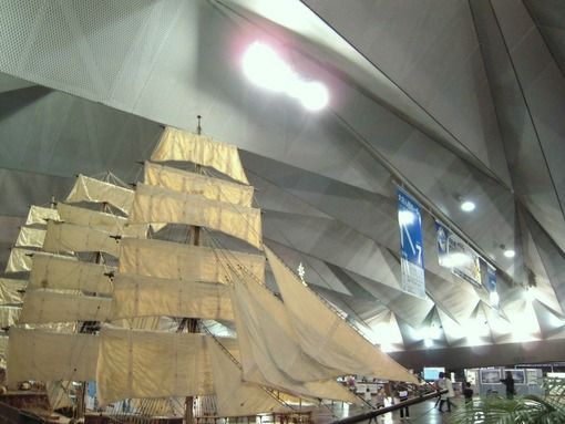 天井も風に揺れる帆を連想するようなデザインで、”くじらのおなか”と呼ばれる2Fフロアーに飾られた帆船とのコントラストが美しい。
