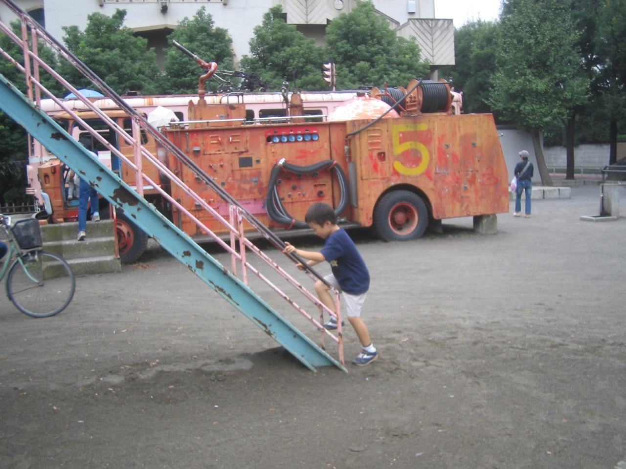 萩中公園(はぎなかこうえん)には、消防自動車やトラック、船等、様々な遊び道具が置いてあります。その消防自動車に上ったりかくれんぼをしたりといろいろな遊び方ができますので、子供達には、とても人気があります。ぜひ、一度、行ってみてください。
