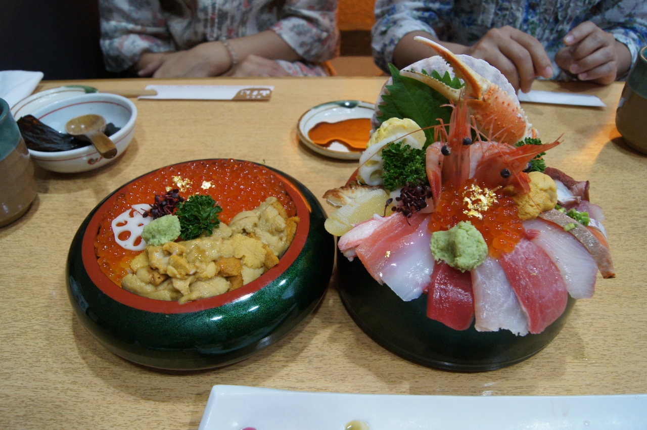 金沢の近江町市場にはじめていきましたので、まず寿司を食べようと市場内を探しましたが、娘の好物のイクラとウニの丼があったのでこちらにはいりました。うにイクラ丼、能登丼、上にぎりを家族3人で頂きました。金箔の載った丼は豪華そのもので、ネタが新鮮なことは言うまでもありません。おいしいことは間違いありませんが、コストパフォーマンスはあまり良いとはいえませんでした。特に上寿司の価格は?でした、カニが旬のときに行けば納得できたかも。