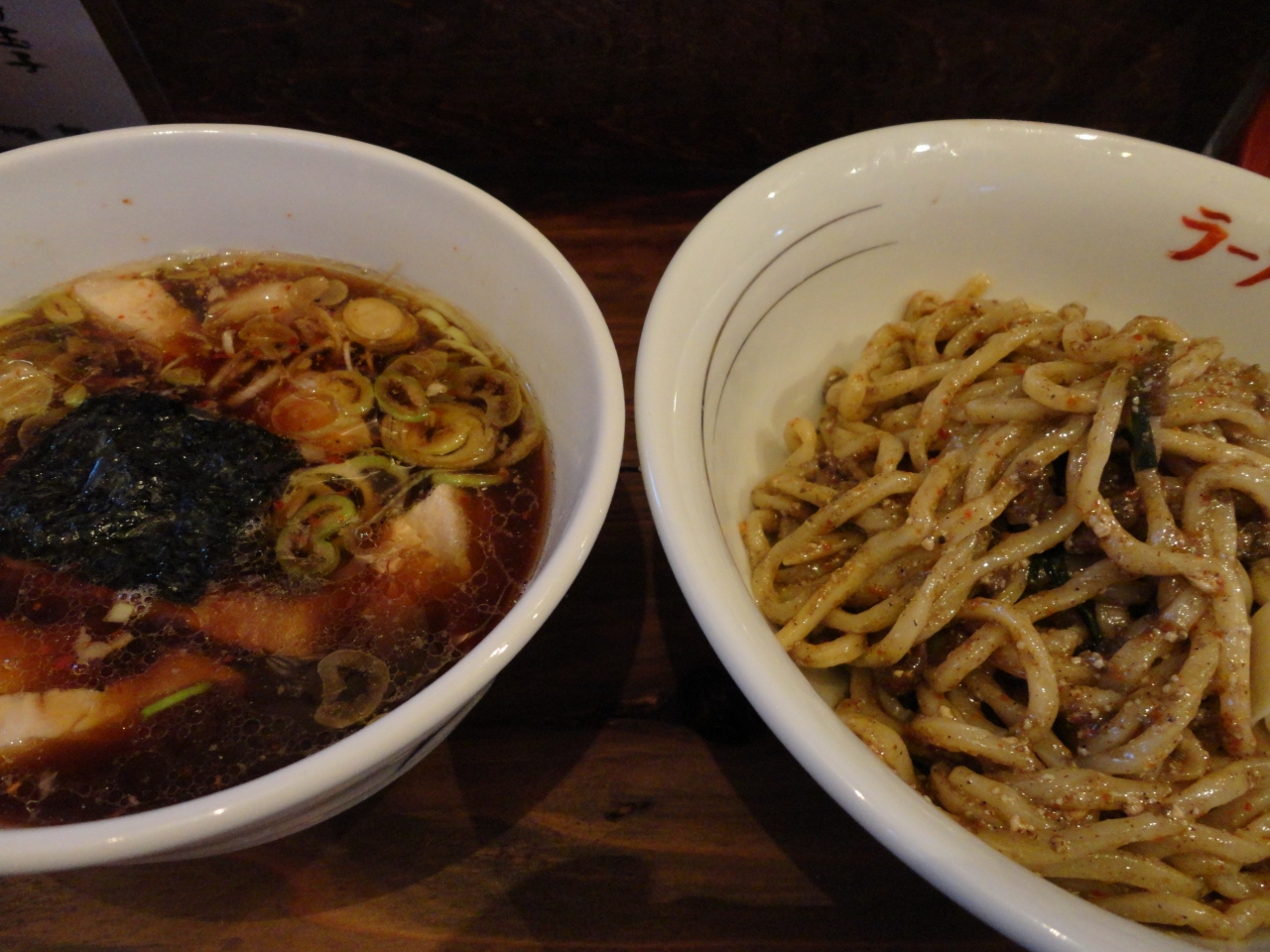 待つこと約10分、出てきた麺は黒麻婆豆腐を和えた太麺。つけ汁は鶏と魚介でダシをとっている醤油ベース。