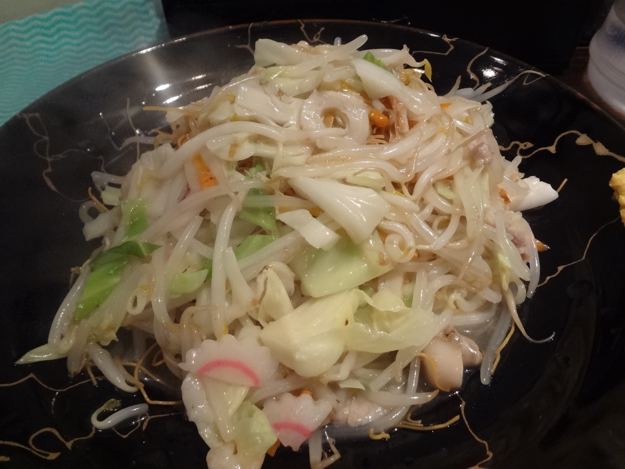 猛暑ゆえ、皿うどんをセレクト。小(750円)、中(850円)、大(1300円)の3通りの大きさがあります。この値段設定からすると、大はとんでもなく大きいのでは?と思い、中(850円)をオーダーしました。