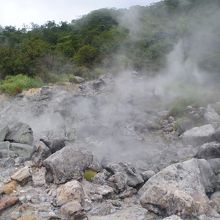 大型の旅館が建ち並んでおり、いかにも温泉街という中に雲仙地獄があり、まずは岩の間から立ちこめる湯気の多さにびっくりさせられます。