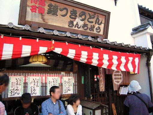 江戸時代の建物が立ち並ぶ蔵造り通りの中程に、名所「時の鐘」があり、その目の前に手打ちうどんが自慢の「鐘つきうどん きんちょう」があります。