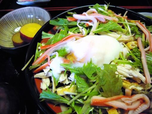 水菜、鶏肉、温泉玉子と具沢山で、麺だけだと不足しがちな栄養も取れ、バランス良い一品。さつま芋の煮もの、漬物も付く。