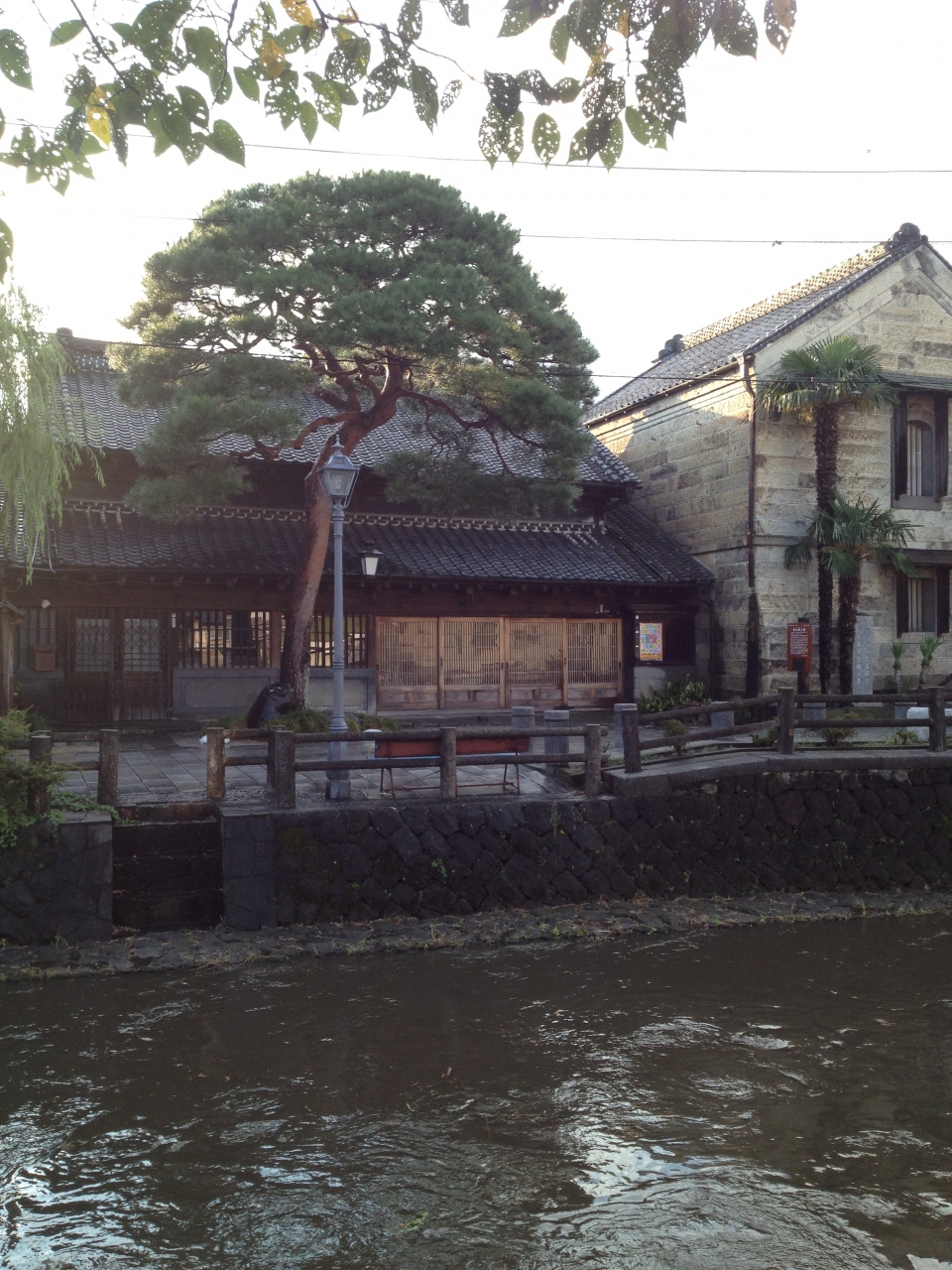 左右対称の立派な蔵が印象的な、歴史を感じる建物。川沿いの風景とマッチして、とても目を引きます。