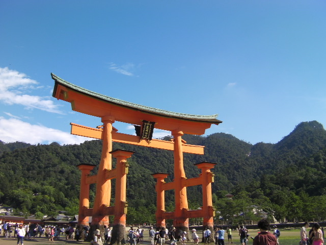 念願の厳島神社。少しでもたくさん見るために大鳥居の近くを通ってくれるフェリーで向かいました。天気が良く神社の赤、空と海の青、山の緑のコントラストがとてもきれいで印象的でした。潮が引いているときに大鳥居のすぐそばまで行くことができます。ぜひ時間を合わせていかれることをオススメします。神社は思ったより広くはないですが回廊などゆったりした造りで人が多くてもスムーズに移動できました。