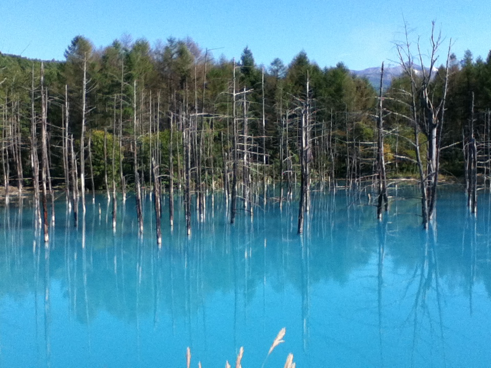 2011年、2012年と続けて訪れています。2012年は乗用車の駐車場が池に近くなり、歩く距離が短くなり嬉しかったです。歩き出してすぐにバスクリーンを入れたお風呂?みたいにきれいな青色の池が見えます。絵を描いている人がいて、その場所が一番良かった。青い池と木々、水面に映る木々、木々の間から山が見えていました。