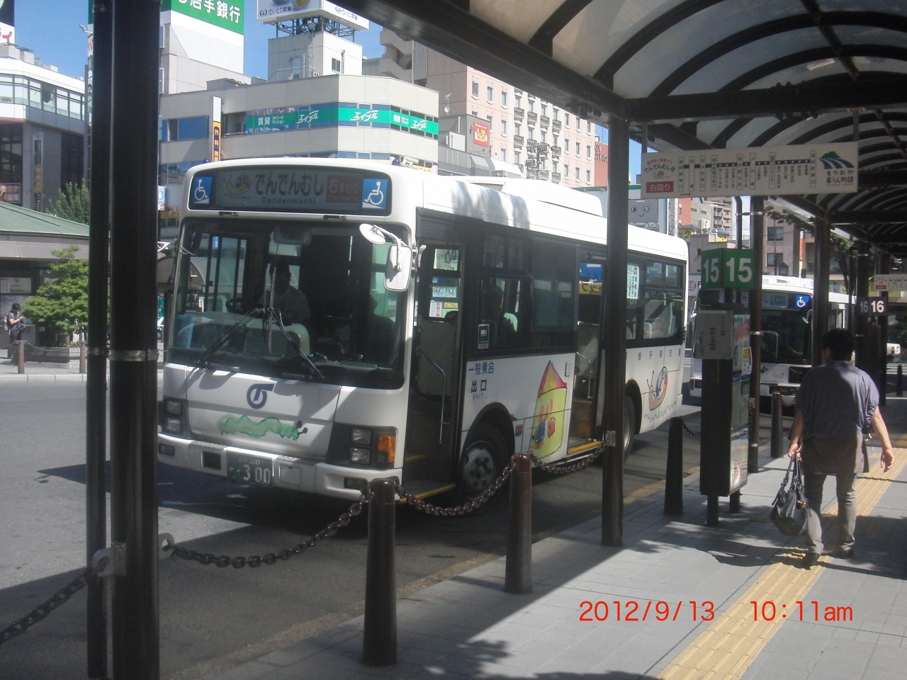 JR盛岡駅の東口の路線バス、ターミナルに、この「でんでん虫号」専用の場所があり「左回り」と「右回り」の2種類のバスがありますが、停車場所は、まったく同じです。 盛岡市役所、大学病院、バス・センターや盛岡城跡公園で上下車する人が多いようです。