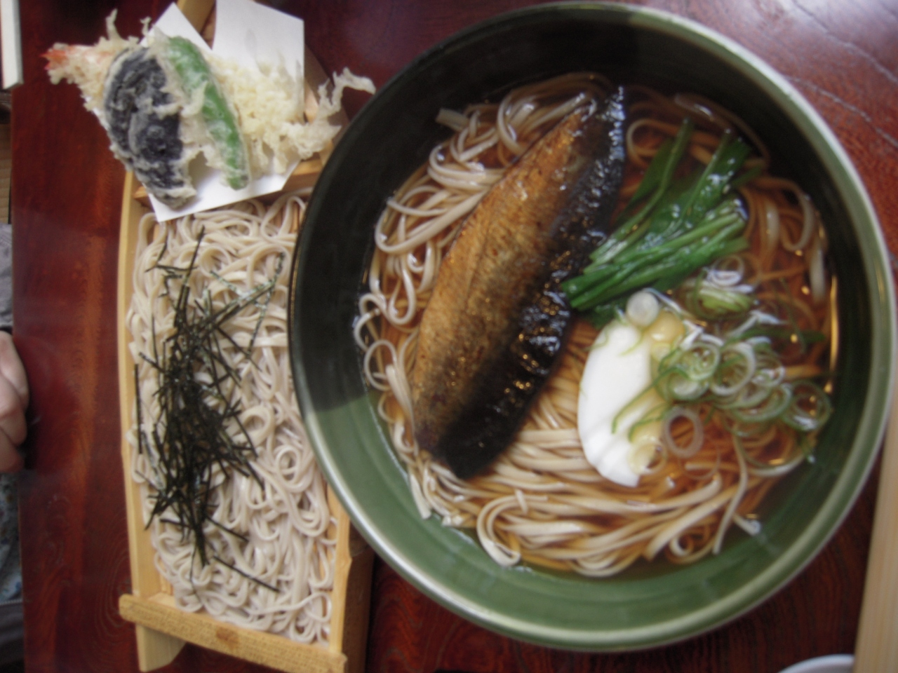 神代植物公園を散策した後公園の東出口を出て、深大寺門前の通りを散歩し、名物の蕎麦を食べることにしました。門前の通りには、何軒もの蕎麦屋・お土産屋が並んでおり、迷いましたが、「創業文久年間 元祖 嶋田家」という屋号と店構えに惹かれ入店しました。1階の奥、風情ある池に面した離れあずまやで雰囲気がとてもよかったです。お蕎麦は「天ぷらそば」とニシン蕎麦をいただきました。