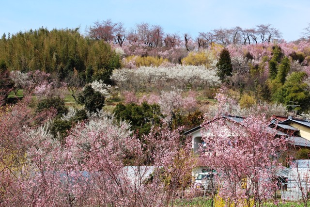 福島市郊外の山辺にあります。4月にはピンク、黄色など色とりどりの花たちが咲き競います。一帯は、民家が点在している場所ですが、市道を散策しながら花を眺めることができます。4月には交通規制が行われ、大勢の観光客がやってきます。東京方面からのツアーもたくさん組まれています。
