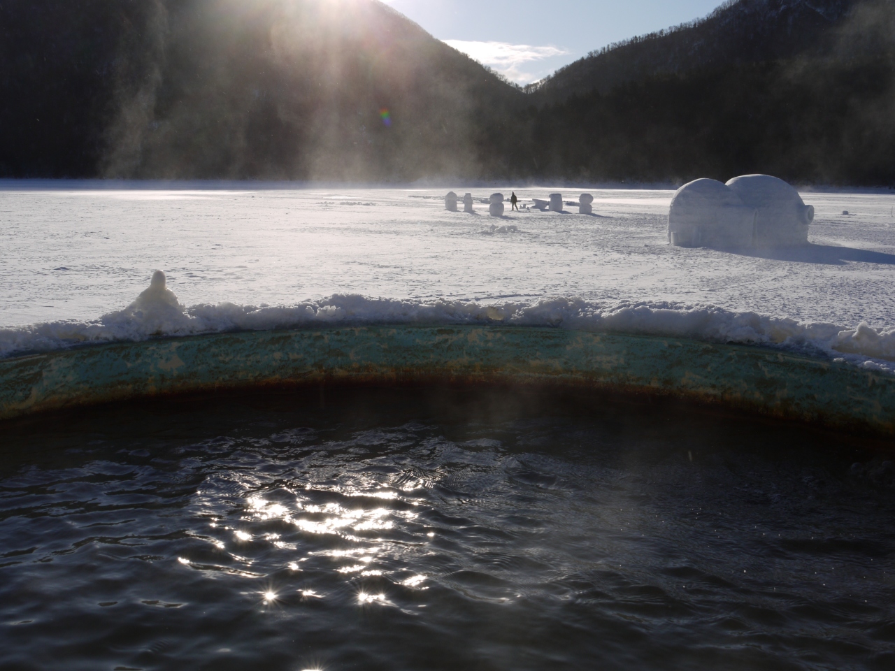 帯広の町からバスで1時間ほど。冬は無料バスが出ています。然別湖は真冬に凍り、その上にカマクラが出来て、その中にバーがオープンしたり、雰囲気は最高。最大のスポットは氷上露天風呂。氷の上に露天風呂が出来て、冷たい風と温かいお湯が最高。夜には満点の星空が独り占め出来ます。混浴の時間もありますので、カップルにお勧め。