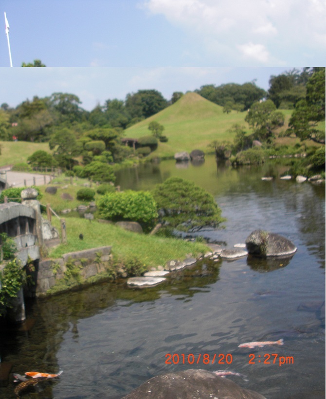 広い池に色鮮やかな鯉が泳ぎ、緑色した小山がきちんと整備されています。
