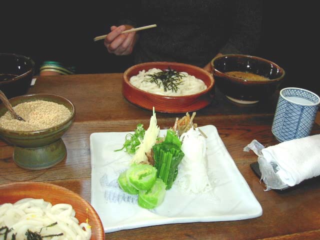 おすすめの名物メニュー「名代おめん」はうどんをつけ麺にたっぷりのゴマと野菜を入れて食べます。他にも季節のメニューがいろいろありました。人気の有名店なので、紅葉の時期のお昼時に行ったら列が出来ていました。