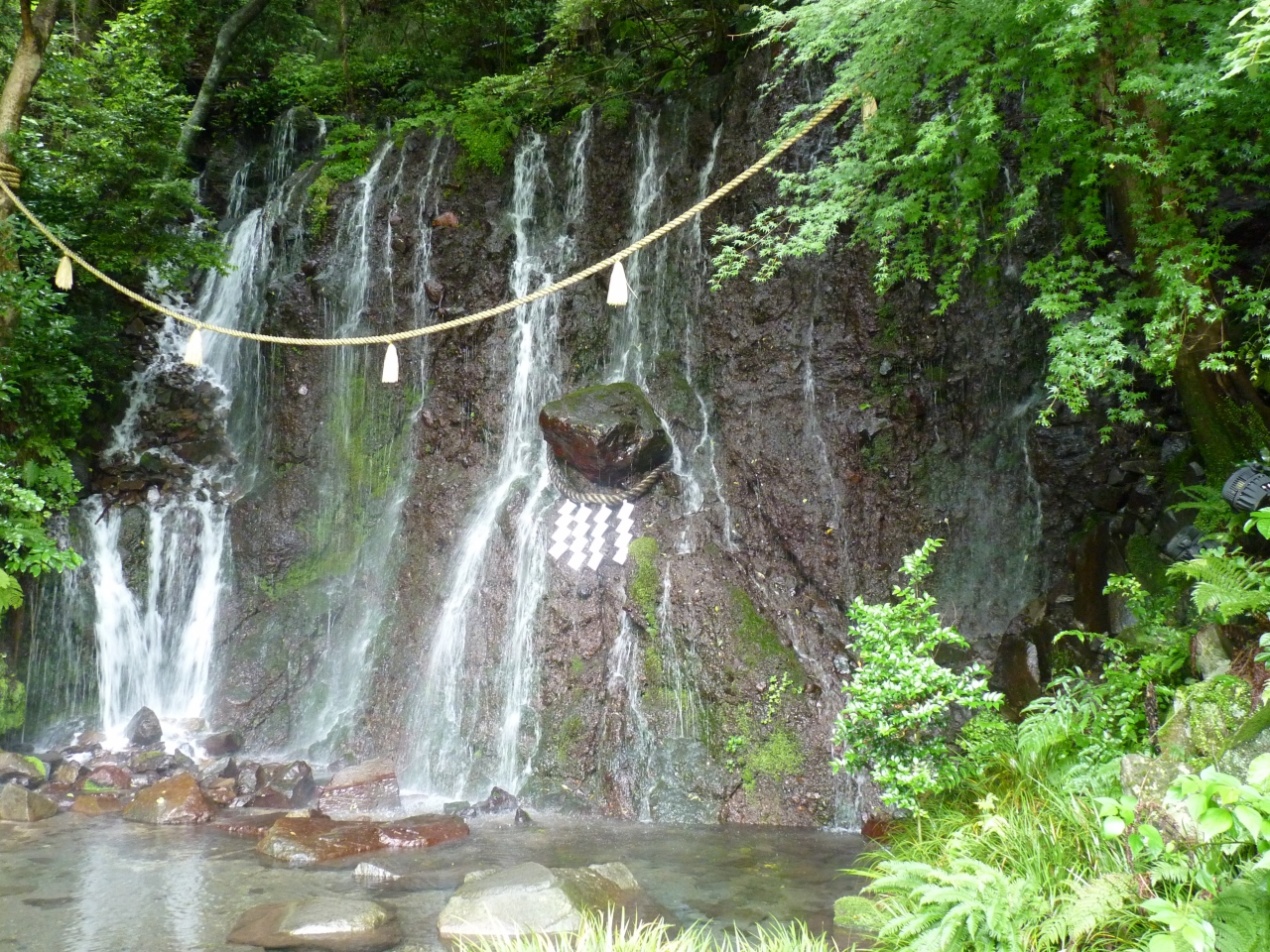 天成園の庭園にあります。庭園自体がとても綺麗で小川や池あり鯉なども泳いでます。滝は小さいものですが白糸の様に落ちてくる様子はとても綺麗です。滝つぼに飛び石が敷いてありますので滝の真下まで行けます。ただ石はすべり易いので要注意です。