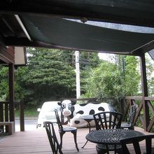 牛のかわいらしい椅子と一緒に記念撮影している家族がいました。