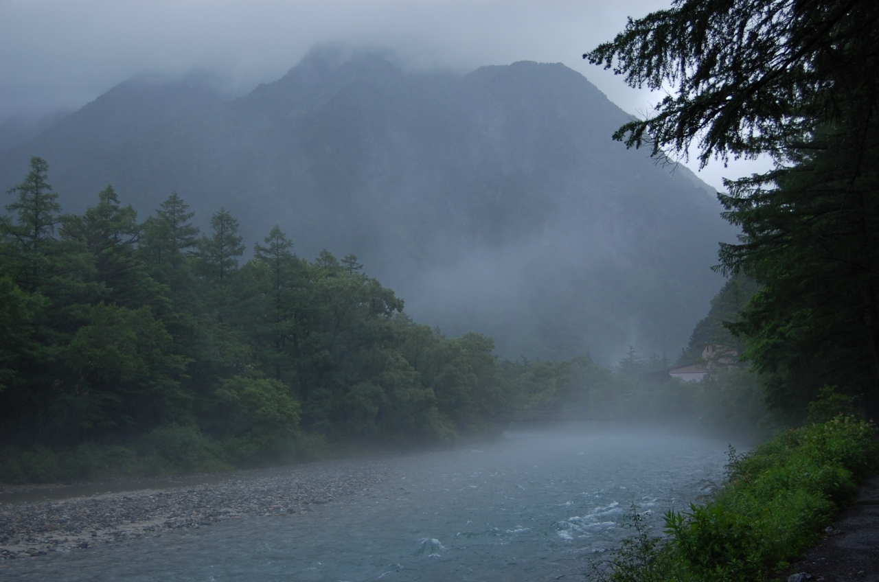 上高地の雨は気持ちがいいです。最初はせっかく上高地に来たのに何で雨なんだろうと思っていました。しかもだんだんひどくなってきて豪雨になってきました。
