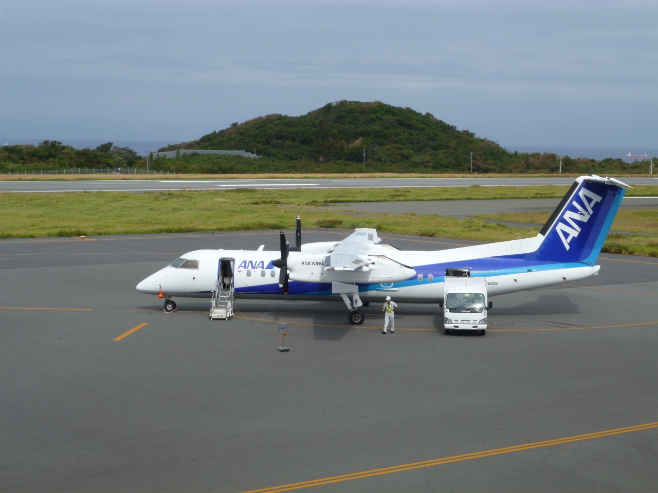 東京都大島空港へは羽田空港からANAがDHC-300型機を一日一往復飛ばしています。実際の飛行時間は30分位です。ブリッジの設置が無く2Fの出発階から階段を降りて飛行機に搭乗します。2Fに椿油等大島の名産を販売する売店があります。