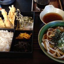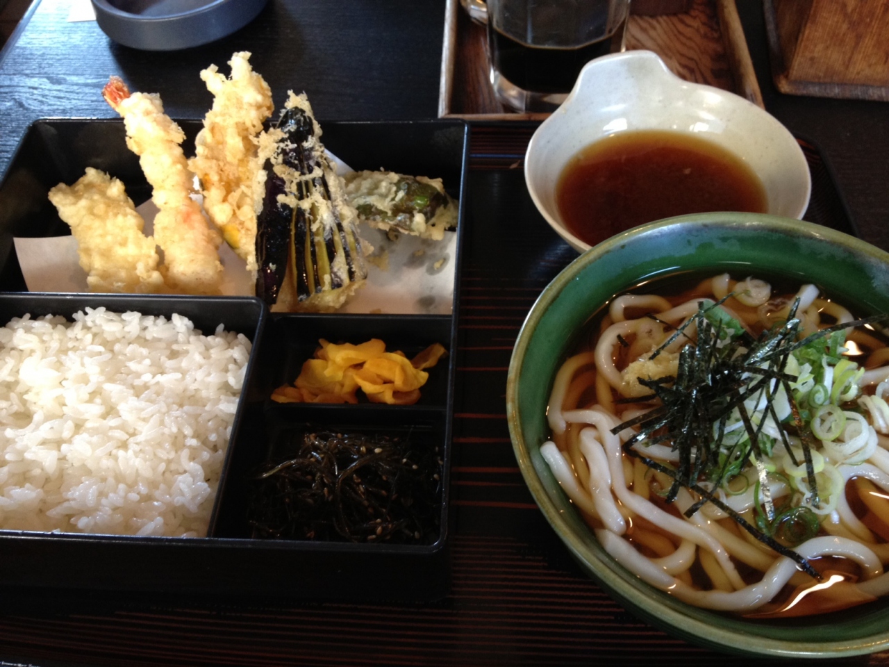 暑い日だったので、冷たいおうどんのセットをオーダーしました。冷たいおうどん=ざるうどん...と勝手に想像していましたが、出てきたのは、冷たいダシの中に冷たくしめたうどん。香川県でいうところの「ひやひや」です。濃いダシにたぷたぷ浸かったうどんは、結構おいしかったです。