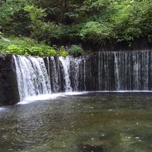 川沿いの小道を少し歩けば白糸の滝がある。オゾンをいっぱい感じる。人も多いが、夏でもここは涼しい。ここは湯川の源泉にある滝で、湾曲した岩壁に数百条の地下水が白糸のように落ち、降りそそぐ水と苔と岩が見事であり、涼しさを感じさせる。