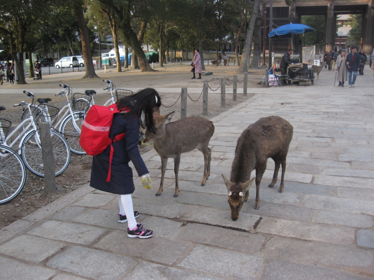 鹿さんに会いたくて奈良公園に行きました。鹿さんがいないので、探していたら1頭発見!早々に鹿せんべいを購入したら、次から次へと何処からともなく集まって来て、気がつくとたくさんの鹿に囲まれて身動きが出来ず、大変になってしまいました。鹿せんべいがなくなると鹿の群れがいなくなり、ふと娘のコートを見ると鹿のよだれがべっとりになってしまいました・・・