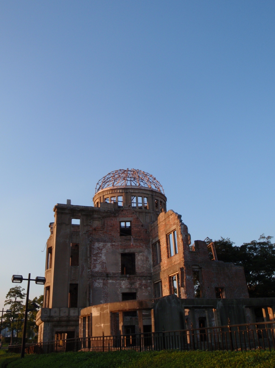 原爆ドームはもともとは1915年に建てられた広島県産業奨励館で、当時はモダンでな建物でしたが、爆心地のすぐ近くにあるため、爆風と熱のためドーム屋根は骨組みだけ、レンガの壁も崩れ落ち、一部の壁が何とか支えて建っている状態になり、現在では原爆の悲惨さを今に伝えるシンボルで倒壊しないよう保存されています。ちょうど私が訪れた時は夕日に照らされ壁が赤く染まりまるで燃えているようでした。