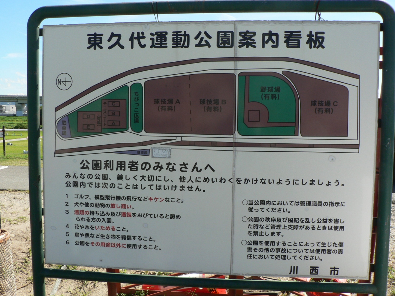 兵庫県川西市の川西市立 スポーツ施設 東久代(ひがしくしろ)運動公園は野球場、球技場、テニスコートなどのスポーツ施設を持つ公園。猪名川河川敷にあるスポーツ公園でJR北伊丹駅から東へ徒歩約10分で行ける便利な場所にあり、市民に親しまれている。