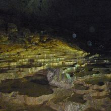 かつては千枚皿とも呼ばれた時期もあったようですが、実際には500枚くらいなので、百枚皿と呼ばれているようです。秋芳洞内全体がそうなのですが、少しずつ少しずつできて今の形になるまでに何万年とかかるもので貴重な自然遺産です。青天井と並ぶ、前半のみどころのひとつです。