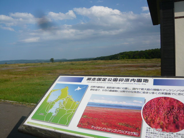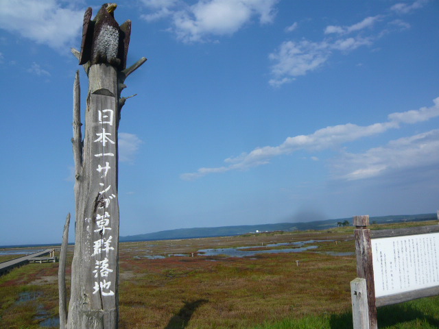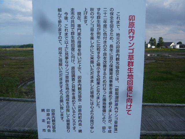 能取湖の南側、卯原内地区はサンゴ草で有名なので行ってきました。が、とても残念な状況でした。掲げられていた看板によれば、サンゴ草の色付きが良くなかったので、それを改善しようとした結果、改善策が上手くいかなかったようで、群生地が縮小してしまったとのこと。確かに、地面や水が見えるほど禿げてしまっていて、サンゴ草が植わっていない場所が多く、サンゴ草自体も枯れてしまっているように見えました。今後、対応していくようですが、二度と失敗しないよう祈るばかりです。