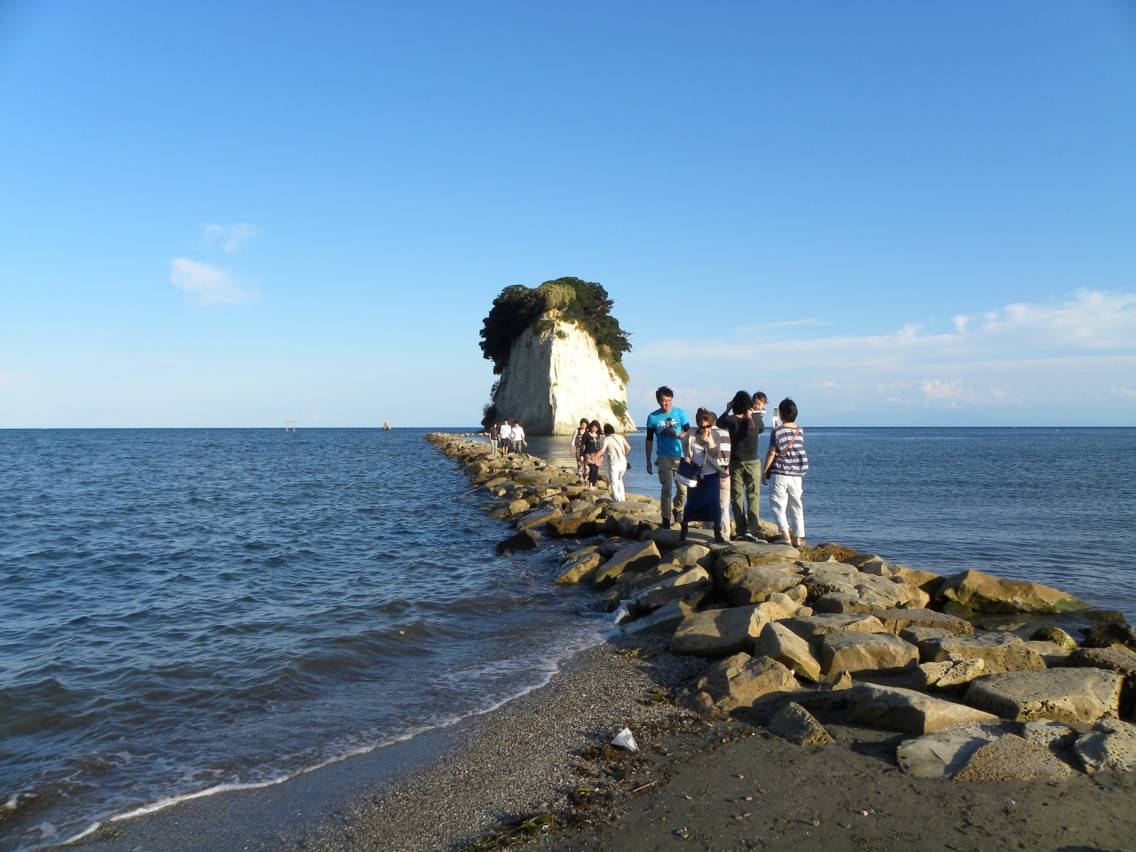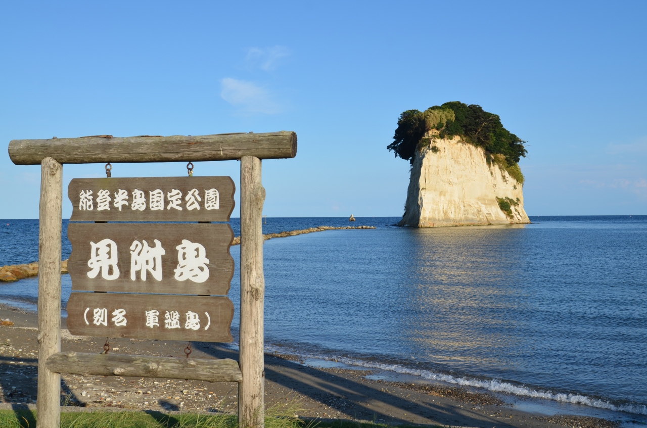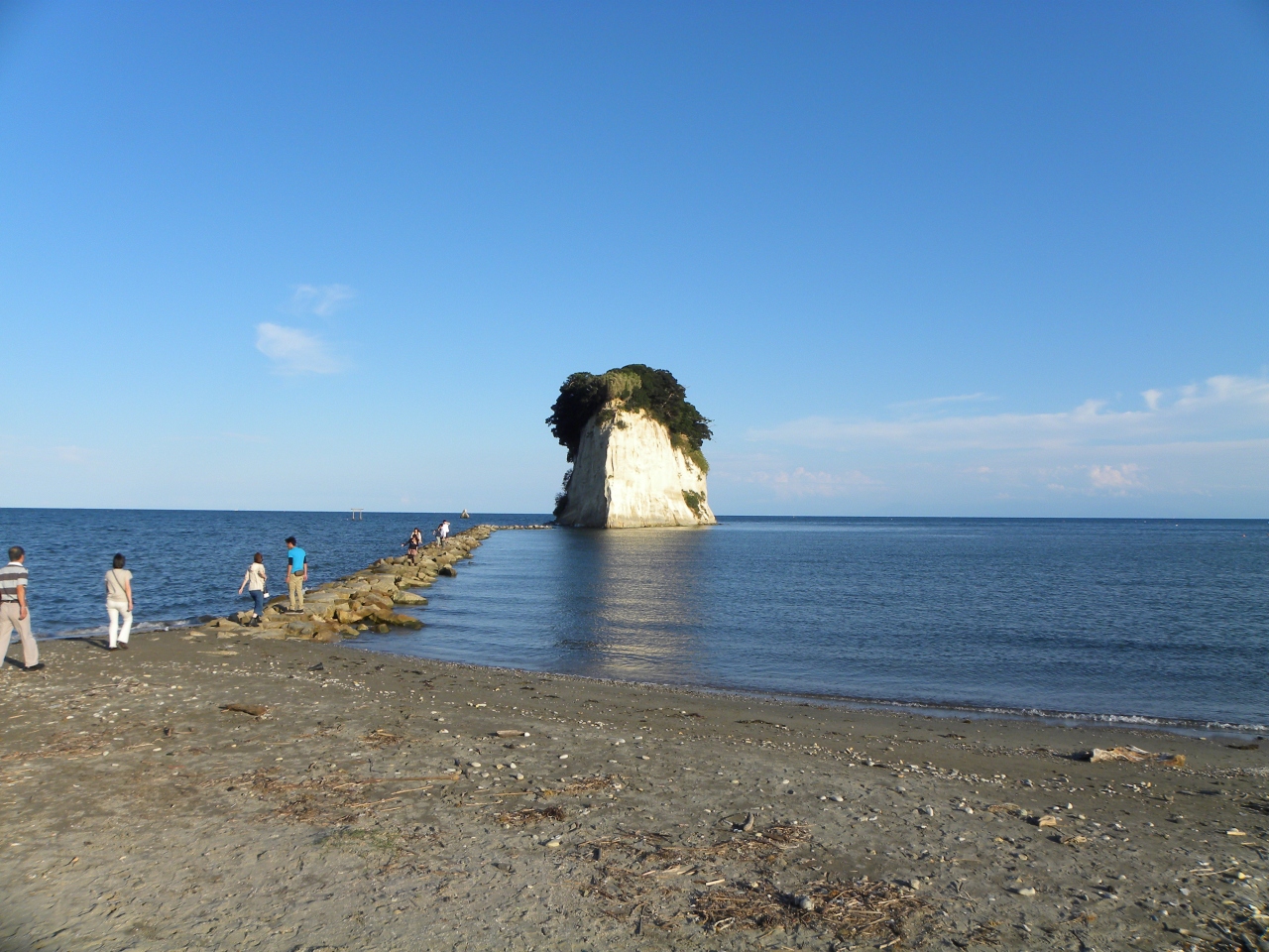 空海が 佐渡から布教のため能登へやって来たとき 初めて見た島なので 「見附島」と名づけられたそうですが、明らかではないそうです。 でも 別名「軍艦島」は 見ての通り そのものでした。でもよく見ると アフロヘアーのおじさんにも見えたりして…^_^;