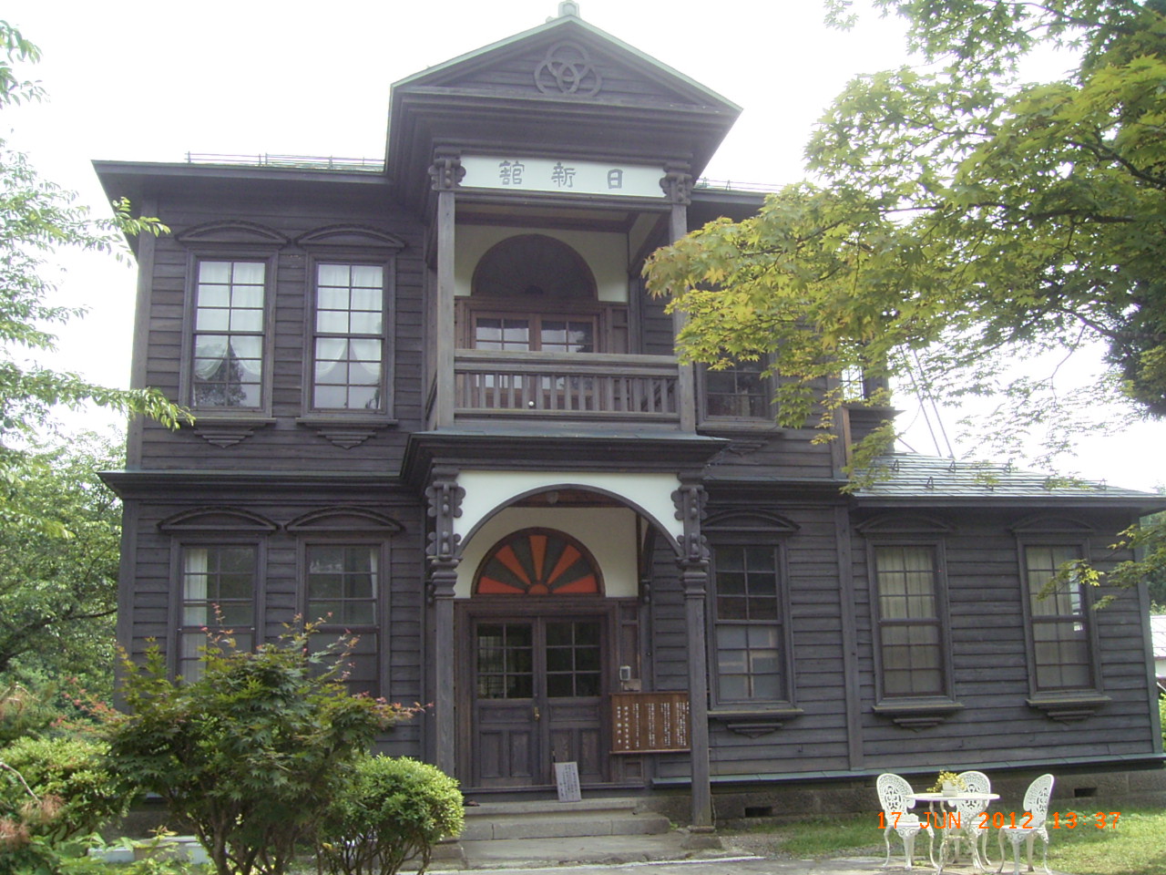 明治の時代に建てられたものです。この地の旧制の中学校の教師に赴任した外国の教師が住むために建てられたものです。門の上にはステンドグラス、室内には高い天井と通風孔などや洋室などがあります。現在は個人の所有ですが見学はできます。