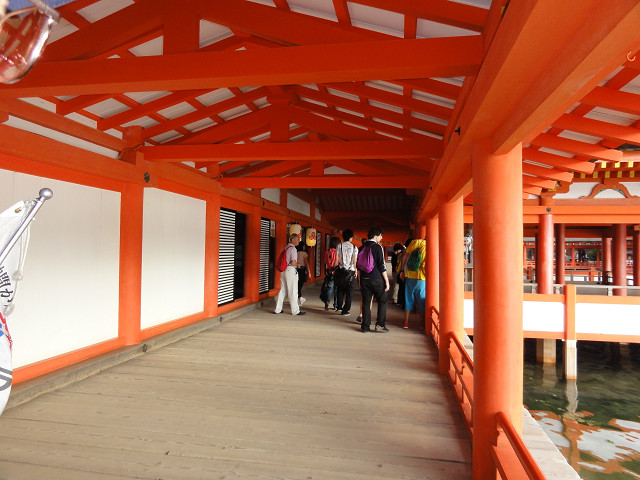 格安パック旅行のオプションで厳島神社参拝して来ました。宮島到着後、脇目もふらず土産物店の案内人に付いて神社に行きました。潮が引き始めた時間でしたが、歩いて鳥居に行ける状態ではありませんでした。
