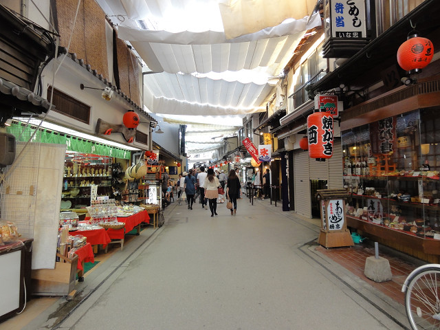 宮島桟橋から厳島神社までの表参道は、赤い提灯が飾られ「清盛通り」と呼ばれてました。神社まで案内をしてくれた人の土産物店「だいこん屋」もありました。「もみじまんじゅう」「しゃもじ」の名物の他、練り製品、Cafe,レストラン、焼き牡蠣、塩や醤油のお店、牡蠣入りコロッケの立ち食いスタンド等、短い通りですがですが色々なお店があり楽しめました。大きな「しゃもじ」も見られます。