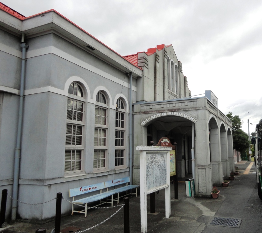 駅舎そのものが市の施設という珍しい駅がJR岩徳線の西岩国駅です。駅舎前には立派なロータリーがあり、タクシーも何台か停車していたけど駅員さんはいません。なぜそんなことになったというと、駅舎があまりにも堂々としているからです。1929年の建築で、錦帯橋をモチーフにしたというアーチ形の入り口に高い天井、木造の改札口など、復元工事が行われたとはいえ、立派な戦前駅の趣を残しています。元々は岩国の玄関口として造られ、1942年に西岩国駅になりました。2004年、駅舎は岩国市に譲渡され、ふれあい交流館西岩国として、利用されており、2006年には国の登録有形文化財に指定されました。