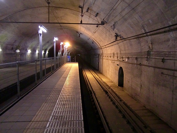 上りのホームは田舎の無人駅で見掛ける何の変哲もないホームなのだが、下りのホームはなんと462段も階段を降りた地下にあります。