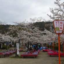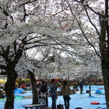 丸山公園は、花見をする場所として有名ですので、桜の木の下には、青いビニールシートがしかれて場所が確保されています。いったのは午前中でしたので、まだ花見の人は少ないですが、夕方からは花見客でいっぱいになります。