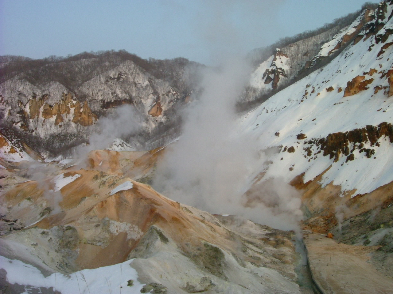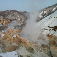 登別温泉の地獄谷は、温泉街の一番奥。といっても、第一滝本館からだと、歩いて数分の近さで、ちょっとびっくり。倶多楽火山の山腹に出来た直径約450mの爆裂火口の周辺一帯には、鉛地獄・鉄砲地獄・昭和地獄・龍巻地獄など15の地獄がありまして、1周約10分(約600m)の遊歩道があります。ただし、遊歩道は冬季期間中で閉鎖されていまして、この日は途中まで。それでも、勢いよく吹き出る蒸気など、十分に活発な火山活動が感じられました。赤茶けた岩肌と白い積雪のコントラストもとてもきれいです。