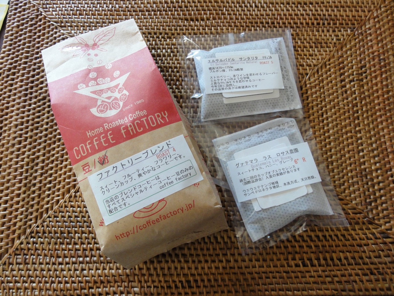 豆を買うとコーヒーが1杯サービスになるようで、水出しコーヒーをテイクアウト、試飲しましたが深い味わいでした。10月1日、今日はコーヒーの日とかで、コーヒー豆100gにつきドリップパック1個がプレゼントでした。購入したコーヒーも美味しかったです。